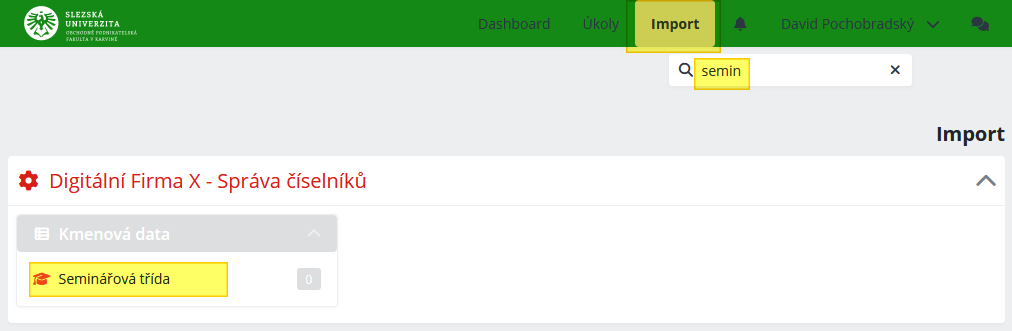 1. Vytvořte Seminářovou třídu v objektu Seminářová třída v typu objektů Digitální Firma X - Správa číselníků ⇒ Kmenová data.