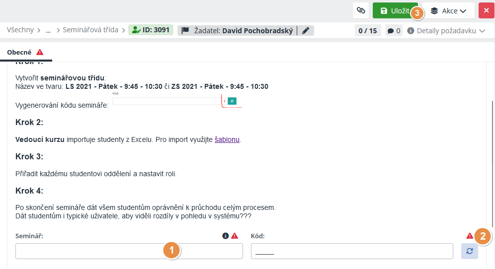 U seminářové třídy zadejte název, vygenerujte kód a uložte.