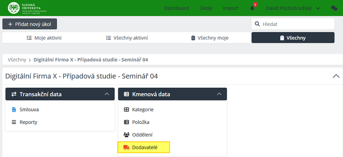 Nový objekt Dodavatel naleznete v Úkoly ⇒ Všechny či Úkoly ⇒ Všechny moje.