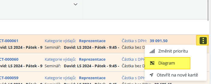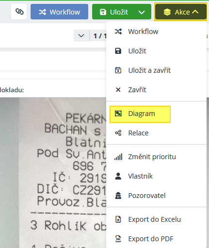 Nastavení procesu a jeho sledování můžete tlačítkem Diagram (v seznamu požadavků pod tlačítkem (1) nebo v detailu požadavku pod tlačítkem Akce (2)), které zobrazí schéma procesu a v jakém stavu proces právě je.